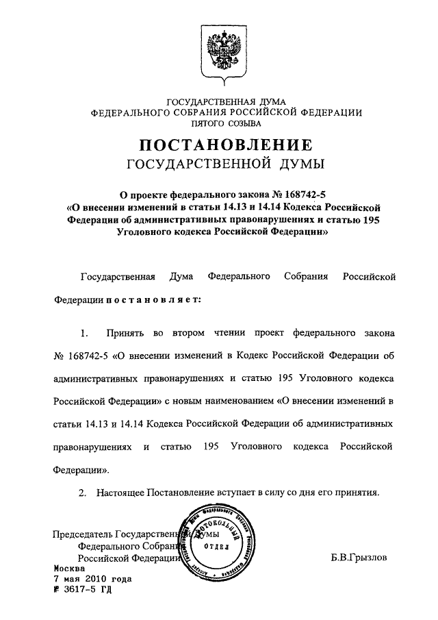 ПОСТАНОВЛЕНИЕ ГД ФС РФ от 07.05.2010 N 3617-5 ГД