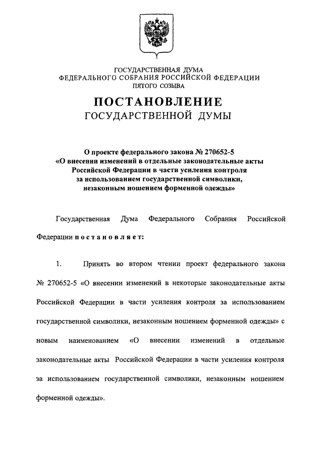 "О ПРОЕКТЕ ФЕДЕРАЛЬНОГО ЗАКОНА N 270652-5 "О ВНЕСЕНИИ ИЗМЕНЕНИЙ В ОТДЕЛЬНЫЕ ЗАКОНОДАТЕЛЬНЫЕ АКТЫ РОССИЙСКОЙ ФЕДЕРАЦИИ В ЧАСТИ УСИЛЕНИЯ КОНТРОЛЯ ЗА ИСПОЛЬЗОВАНИЕМ ГОСУДАРСТВЕННОЙ СИМВОЛИКИ, НЕЗАКОННЫМ НОШЕНИЕМ ФОРМЕННОЙ ОДЕЖДЫ"