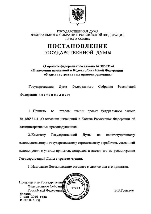 ПОСТАНОВЛЕНИЕ ГД ФС РФ от 07.05.2010 N 3619-5 ГД