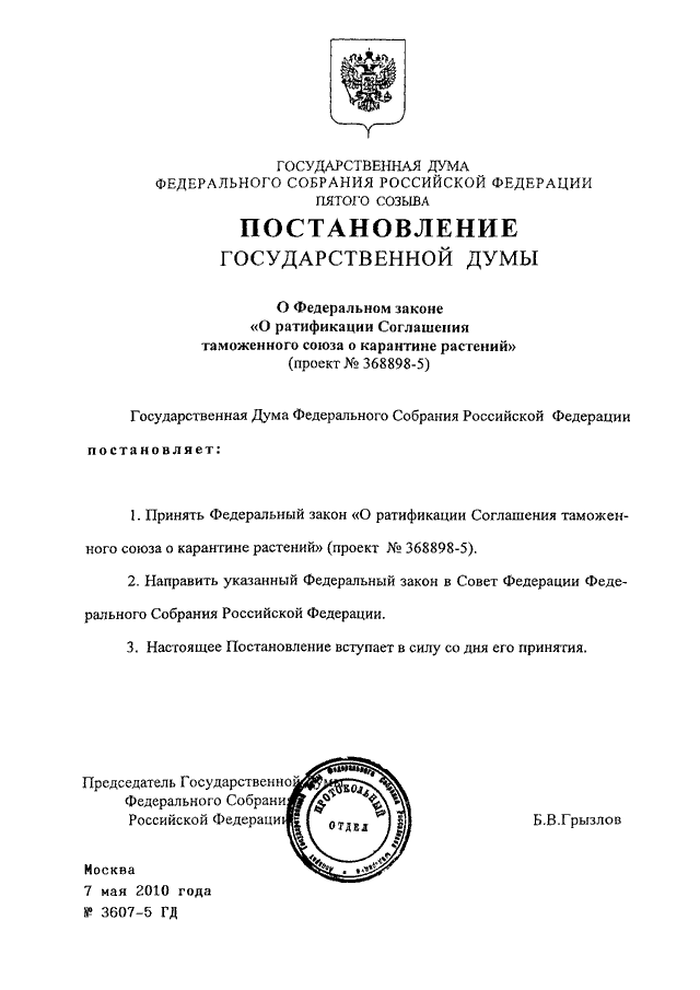 ПОСТАНОВЛЕНИЕ ГД ФС РФ от 07.05.2010 N 3607-5 ГД
