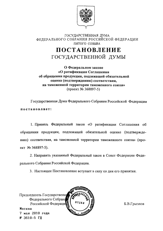 ПОСТАНОВЛЕНИЕ ГД ФС РФ от 07.05.2010 N 3610-5 ГД