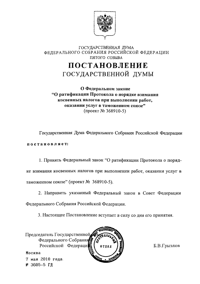 "О ФЕДЕРАЛЬНОМ ЗАКОНЕ "О РАТИФИКАЦИИ ПРОТОКОЛА О ПОРЯДКЕ ВЗИМАНИЯ КОСВЕННЫХ НАЛОГОВ ПРИ ВЫПОЛНЕНИИ РАБОТ, ОКАЗАНИИ УСЛУГ В ТАМОЖЕННОМ СОЮЗЕ" (ПРОЕКТ N 368910-5)"