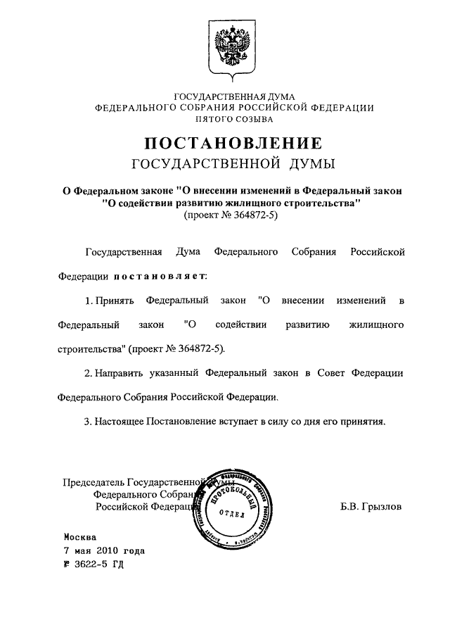 ПОСТАНОВЛЕНИЕ ГД ФС РФ от 07.05.2010 N 3622-5 ГД