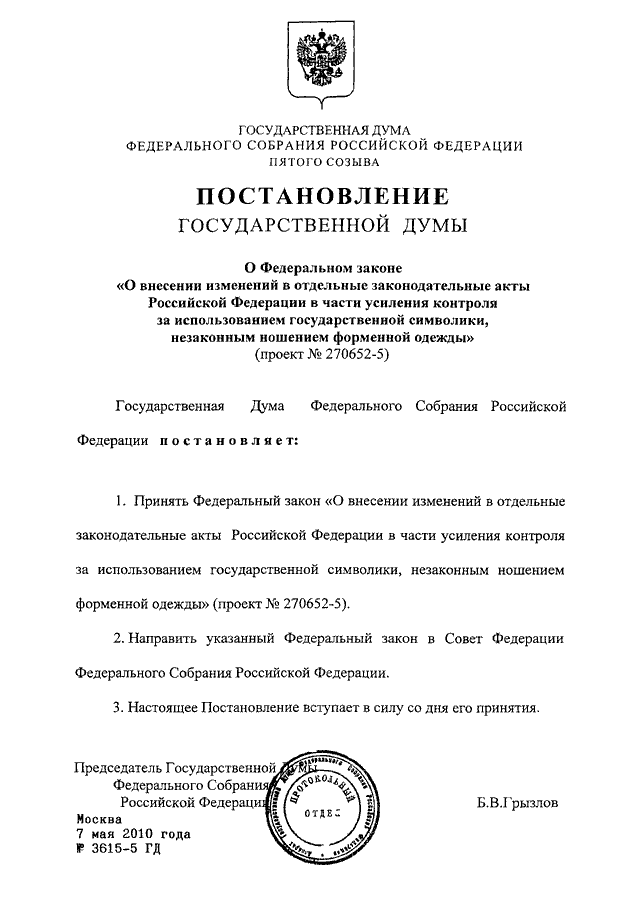 ПОСТАНОВЛЕНИЕ ГД ФС РФ от 07.05.2010 N 3615-5 ГД