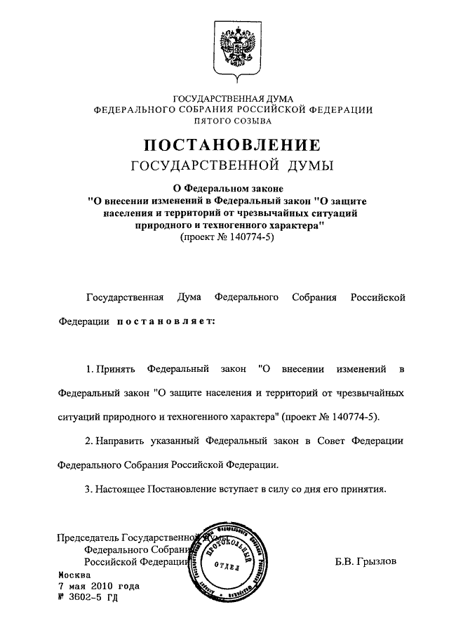 ПОСТАНОВЛЕНИЕ ГД ФС РФ от 07.05.2010 N 3602-5 ГД