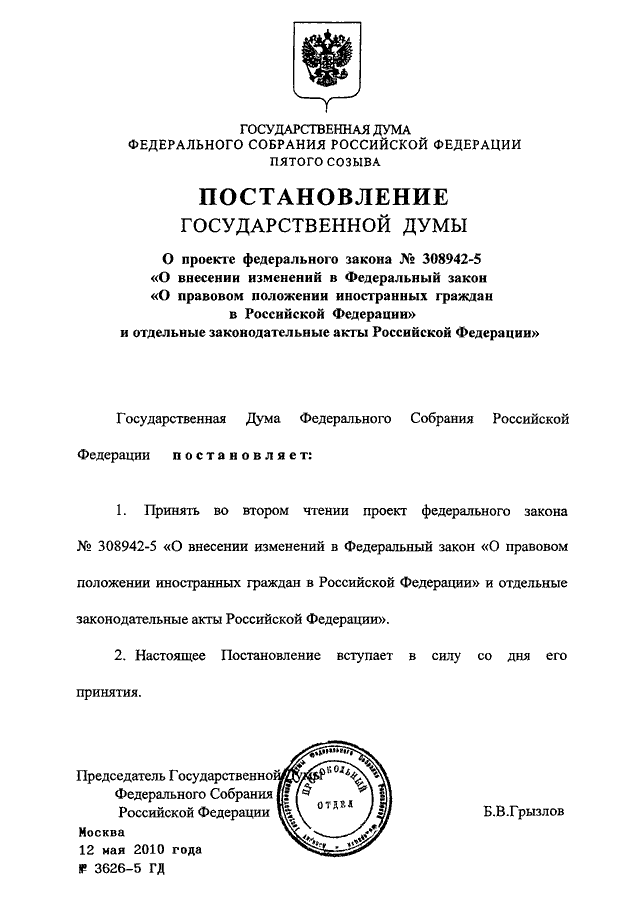 ПОСТАНОВЛЕНИЕ ГД ФС РФ от 12.05.2010 N 3626-5 ГД