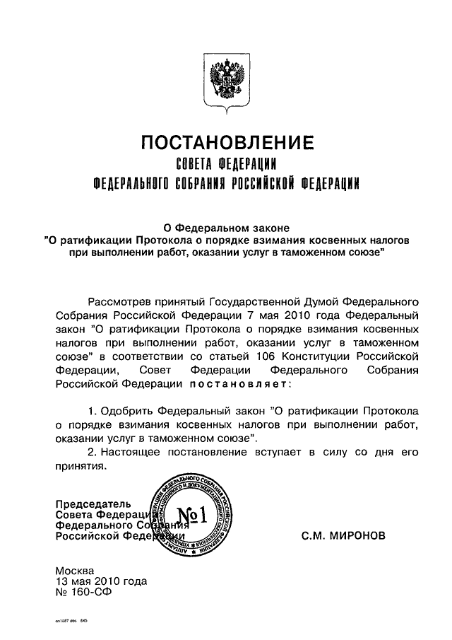ПОСТАНОВЛЕНИЕ СФ ФС РФ от 13.05.2010 N 160-СФ