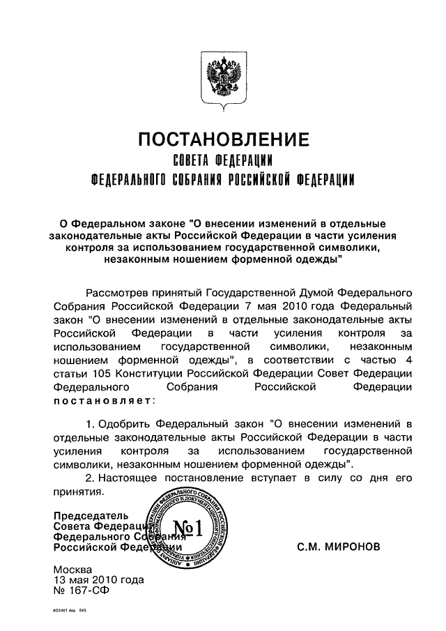 ПОСТАНОВЛЕНИЕ СФ ФС РФ от 13.05.2010 N 167-СФ