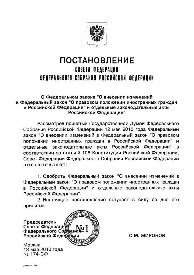 ПОСТАНОВЛЕНИЕ СФ ФС РФ от 13.05.2010 N 174-СФ