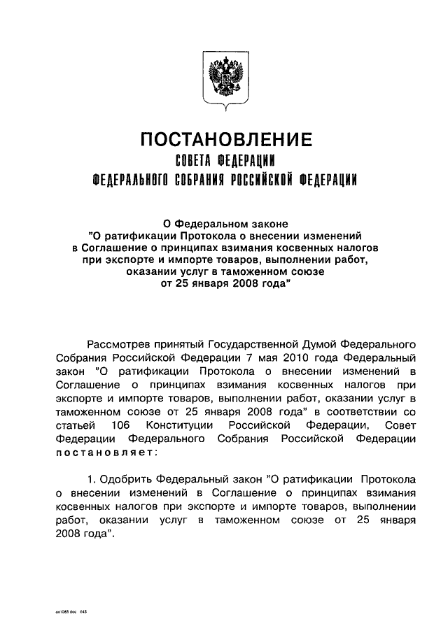 "О ФЕДЕРАЛЬНОМ ЗАКОНЕ "О РАТИФИКАЦИИ ПРОТОКОЛА О ВНЕСЕНИИ ИЗМЕНЕНИЙ В СОГЛАШЕНИЕ О ПРИНЦИПАХ ВЗИМАНИЯ КОСВЕННЫХ НАЛОГОВ ПРИ ЭКСПОРТЕ И ИМПОРТЕ ТОВАРОВ, ВЫПОЛНЕНИИ РАБОТ, ОКАЗАНИИ УСЛУГ В ТАМОЖЕННОМ СОЮЗЕ ОТ 25 ЯНВАРЯ 2008 ГОДА"