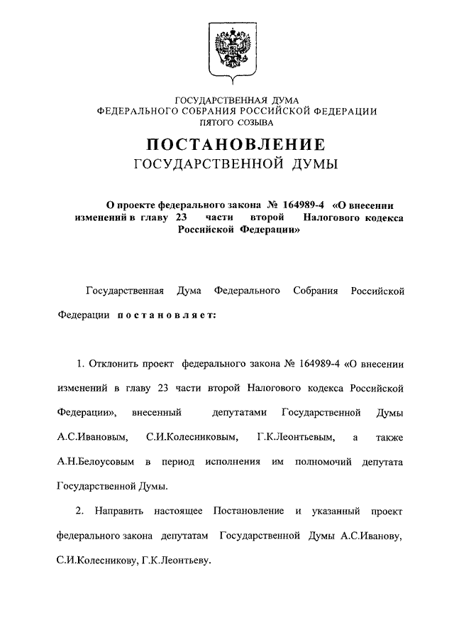 "О ПРОЕКТЕ ФЕДЕРАЛЬНОГО ЗАКОНА N 164989-4 "О ВНЕСЕНИИ ИЗМЕНЕНИЙ В ГЛАВУ 23 ЧАСТИ ВТОРОЙ НАЛОГОВОГО КОДЕКСА РОССИЙСКОЙ ФЕДЕРАЦИИ"