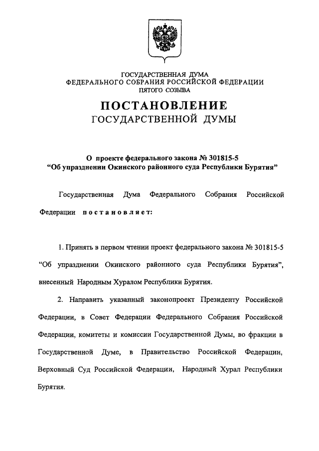 "О ПРОЕКТЕ ФЕДЕРАЛЬНОГО ЗАКОНА N 301815-5 "ОБ УПРАЗДНЕНИИ ОКИНСКОГО РАЙОННОГО СУДА РЕСПУБЛИКИ БУРЯТИЯ"