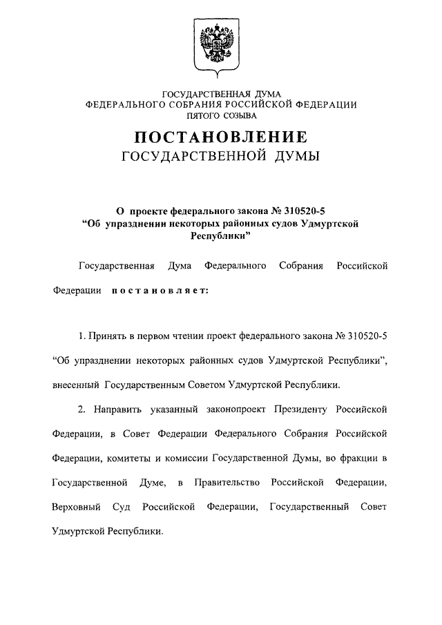"О ПРОЕКТЕ ФЕДЕРАЛЬНОГО ЗАКОНА N 310520-5 "ОБ УПРАЗДНЕНИИ НЕКОТОРЫХ РАЙОННЫХ СУДОВ УДМУРТСКОЙ РЕСПУБЛИКИ"
