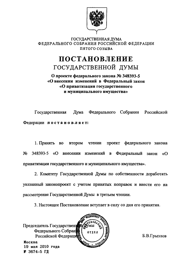 ПОСТАНОВЛЕНИЕ ГД ФС РФ от 19.05.2010 N 3674-5 ГД
