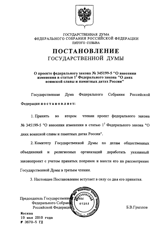 ПОСТАНОВЛЕНИЕ ГД ФС РФ от 19.05.2010 N 3670-5 ГД