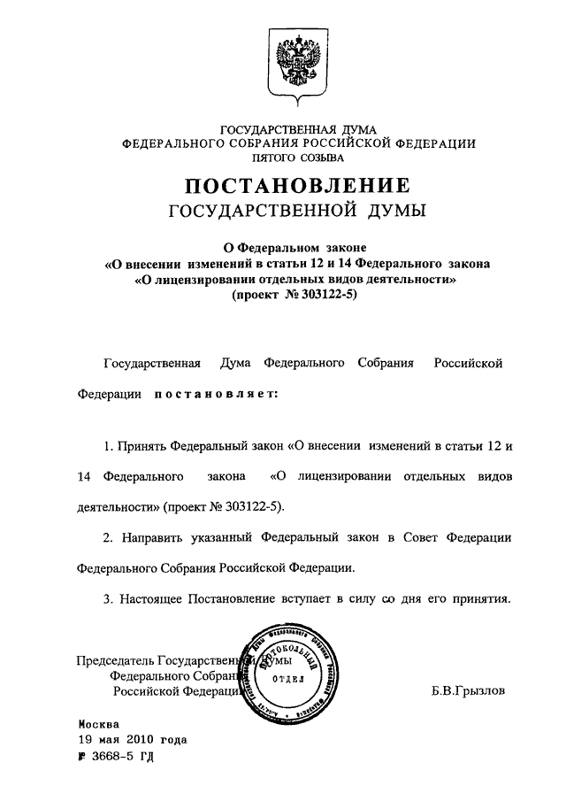 ПОСТАНОВЛЕНИЕ ГД ФС РФ от 19.05.2010 N 3668-5 ГД