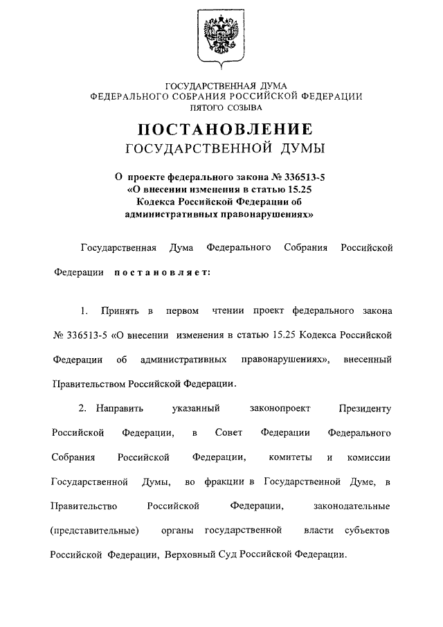"О ПРОЕКТЕ ФЕДЕРАЛЬНОГО ЗАКОНА N 336513-5 "О ВНЕСЕНИИ ИЗМЕНЕНИЯ В СТАТЬЮ 15.25 КОДЕКСА РОССИЙСКОЙ ФЕДЕРАЦИИ ОБ АДМИНИСТРАТИВНЫХ ПРАВОНАРУШЕНИЯХ"