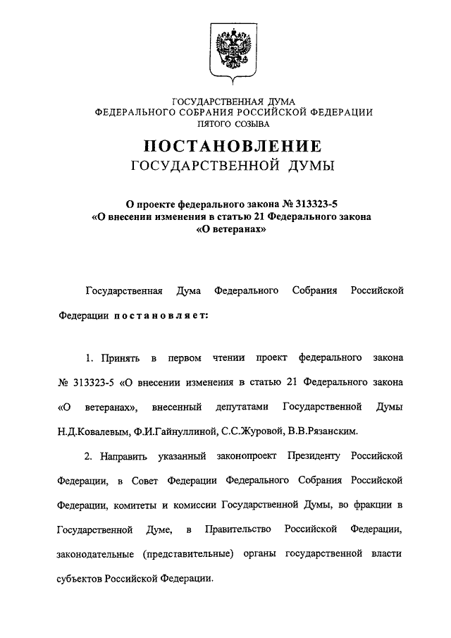 "О ПРОЕКТЕ ФЕДЕРАЛЬНОГО ЗАКОНА N 313323-5 "О ВНЕСЕНИИ ИЗМЕНЕНИЯ В СТАТЬЮ 21 ФЕДЕРАЛЬНОГО ЗАКОНА "О ВЕТЕРАНАХ"
