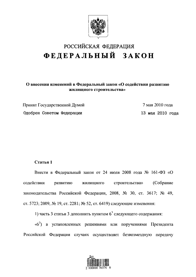 "О ВНЕСЕНИИ ИЗМЕНЕНИЙ В ФЕДЕРАЛЬНЫЙ ЗАКОН "О СОДЕЙСТВИИ РАЗВИТИЮ ЖИЛИЩНОГО СТРОИТЕЛЬСТВА"