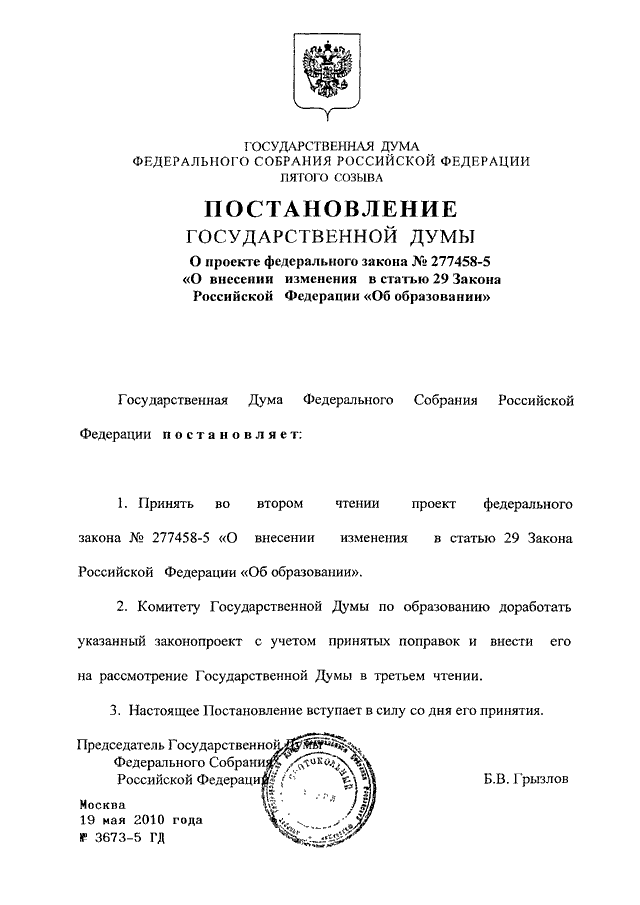 ПОСТАНОВЛЕНИЕ ГД ФС РФ от 19.05.2010 N 3673-5 ГД