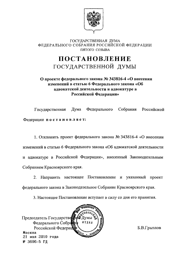 ПОСТАНОВЛЕНИЕ ГД ФС РФ от 21.05.2010 N 3696-5 ГД