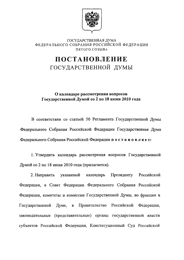 "О КАЛЕНДАРЕ РАССМОТРЕНИЯ ВОПРОСОВ ГОСУДАРСТВЕННОЙ ДУМОЙ СО 2 ПО 18 ИЮНЯ 2010 ГОДА"