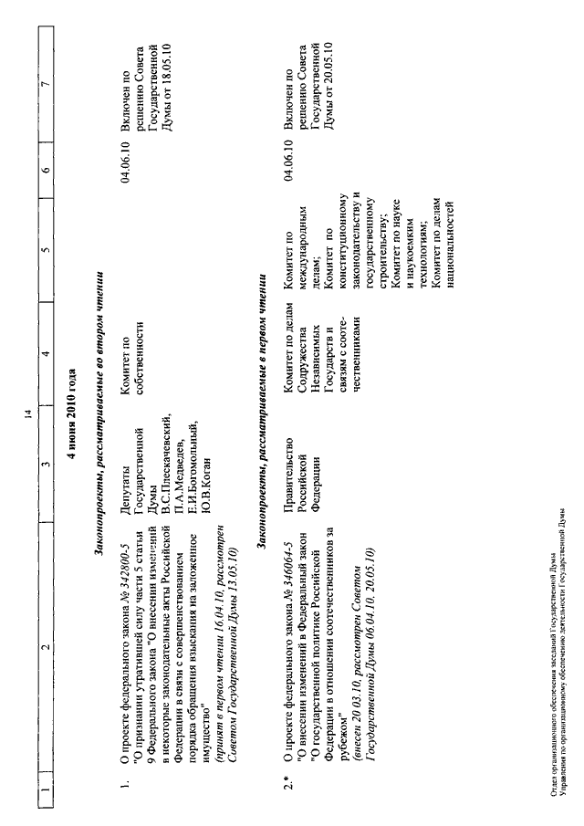 "О КАЛЕНДАРЕ РАССМОТРЕНИЯ ВОПРОСОВ ГОСУДАРСТВЕННОЙ ДУМОЙ СО 2 ПО 18 ИЮНЯ 2010 ГОДА"