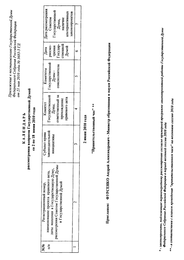 "О КАЛЕНДАРЕ РАССМОТРЕНИЯ ВОПРОСОВ ГОСУДАРСТВЕННОЙ ДУМОЙ СО 2 ПО 18 ИЮНЯ 2010 ГОДА"