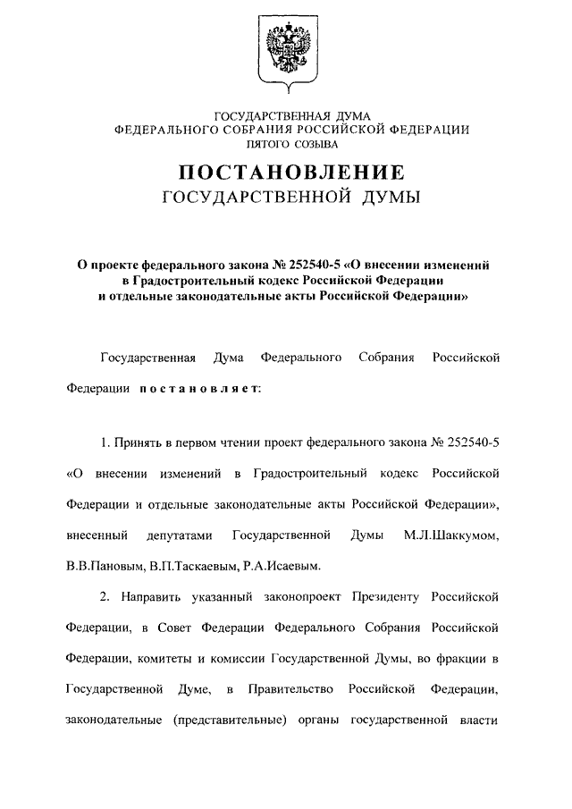 "О ПРОЕКТЕ ФЕДЕРАЛЬНОГО ЗАКОНА N 252540-5 "О ВНЕСЕНИИ ИЗМЕНЕНИЙ В ГРАДОСТРОИТЕЛЬНЫЙ КОДЕКС РОССИЙСКОЙ ФЕДЕРАЦИИ И ОТДЕЛЬНЫЕ ЗАКОНОДАТЕЛЬНЫЕ АКТЫ РОССИЙСКОЙ ФЕДЕРАЦИИ"