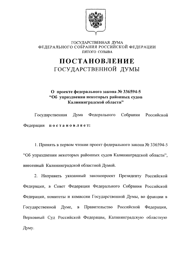 "О ПРОЕКТЕ ФЕДЕРАЛЬНОГО ЗАКОНА N 336594-5 "ОБ УПРАЗДНЕНИИ НЕКОТОРЫХ РАЙОННЫХ СУДОВ КАЛИНИНГРАДСКОЙ ОБЛАСТИ"
