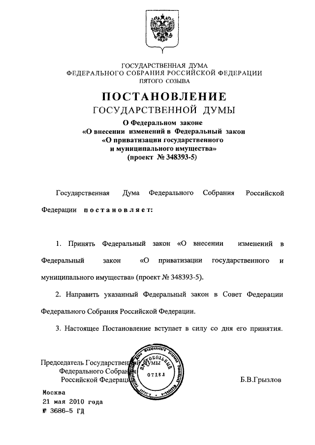 ПОСТАНОВЛЕНИЕ ГД ФС РФ от 21.05.2010 N 3686-5 ГД