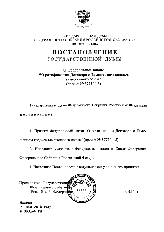"О ФЕДЕРАЛЬНОМ ЗАКОНЕ "О РАТИФИКАЦИИ ДОГОВОРА О ТАМОЖЕННОМ КОДЕКСЕ ТАМОЖЕННОГО СОЮЗА" (ПРОЕКТ N 377504-5)"