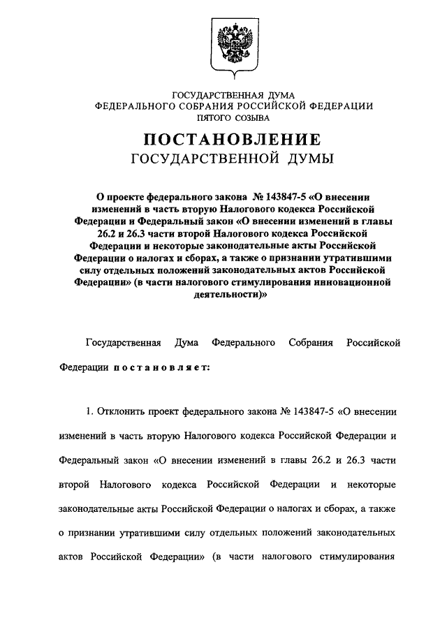 "О ПРОЕКТЕ ФЕДЕРАЛЬНОГО ЗАКОНА N 143847-5 "О ВНЕСЕНИИ ИЗМЕНЕНИЙ В ЧАСТЬ ВТОРУЮ НАЛОГОВОГО КОДЕКСА РОССИЙСКОЙ ФЕДЕРАЦИИ И ФЕДЕРАЛЬНЫЙ ЗАКОН "О ВНЕСЕНИИ ИЗМЕНЕНИЙ В ГЛАВЫ 26.2 И 26.3 ЧАСТИ ВТОРОЙ НАЛОГОВОГО КОДЕКСА РОССИЙСКОЙ ФЕДЕРАЦИИ И НЕКОТОРЫЕ ЗАКОНОДАТЕЛЬНЫЕ АКТЫ РОССИЙСКОЙ ФЕДЕРАЦИИ О НАЛОГАХ И СБОРАХ, А ТАКЖЕ О ПРИЗНАНИИ УТРАТИВШИМИ СИЛУ ОТДЕЛЬНЫХ ПОЛОЖЕНИЙ ЗАКОНОДАТЕЛЬНЫХ АКТОВ РОССИЙСКОЙ ФЕДЕРАЦИИ" (В ЧАСТИ НАЛОГОВОГО СТИМУЛИРОВАНИЯ ИННОВАЦИОННОЙ ДЕЯТЕЛЬНОСТИ)"