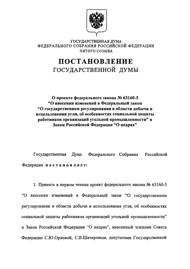 "О ПРОЕКТЕ ФЕДЕРАЛЬНОГО ЗАКОНА N 63160-5 "О ВНЕСЕНИИ ИЗМЕНЕНИЙ В ФЕДЕРАЛЬНЫЙ ЗАКОН "О ГОСУДАРСТВЕННОМ РЕГУЛИРОВАНИИ В ОБЛАСТИ ДОБЫЧИ И ИСПОЛЬЗОВАНИЯ УГЛЯ, ОБ ОСОБЕННОСТЯХ СОЦИАЛЬНОЙ ЗАЩИТЫ РАБОТНИКОВ ОРГАНИЗАЦИЙ УГОЛЬНОЙ ПРОМЫШЛЕННОСТИ" И ЗАКОН РОССИЙСКОЙ ФЕДЕРАЦИИ "О НЕДРАХ"