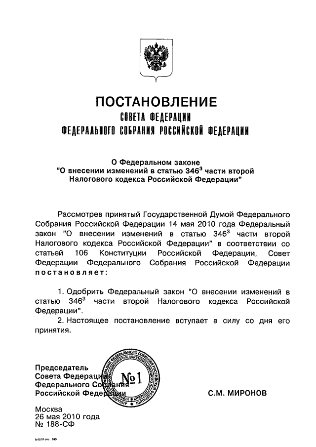 ПОСТАНОВЛЕНИЕ СФ ФС РФ от 26.05.2010 N 188-СФ