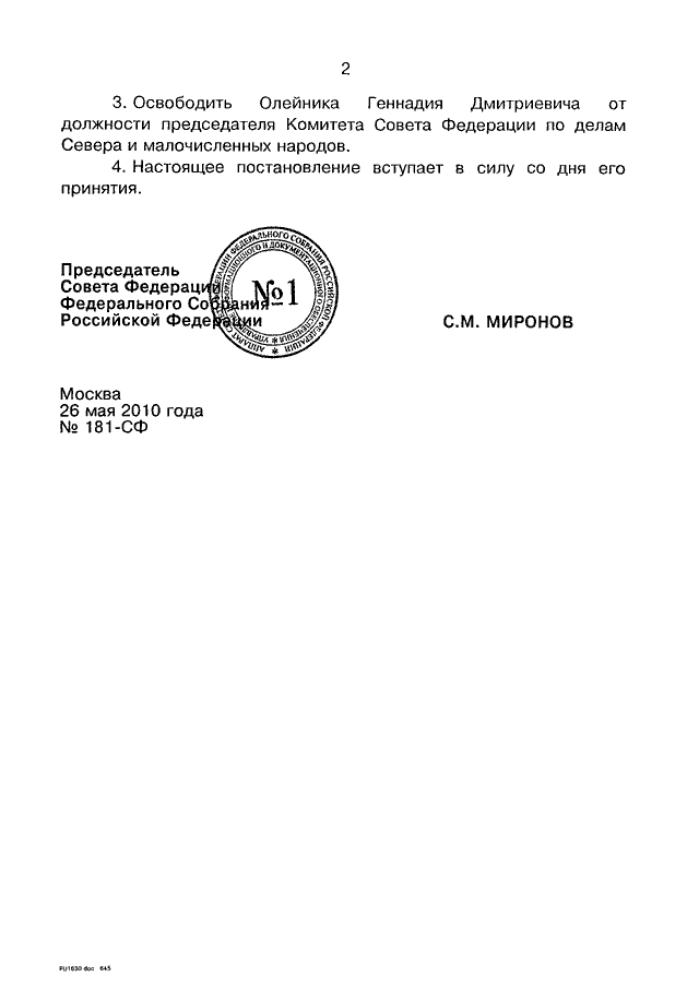 ПОСТАНОВЛЕНИЕ СФ ФС РФ от 26.05.2010 N 181-СФ