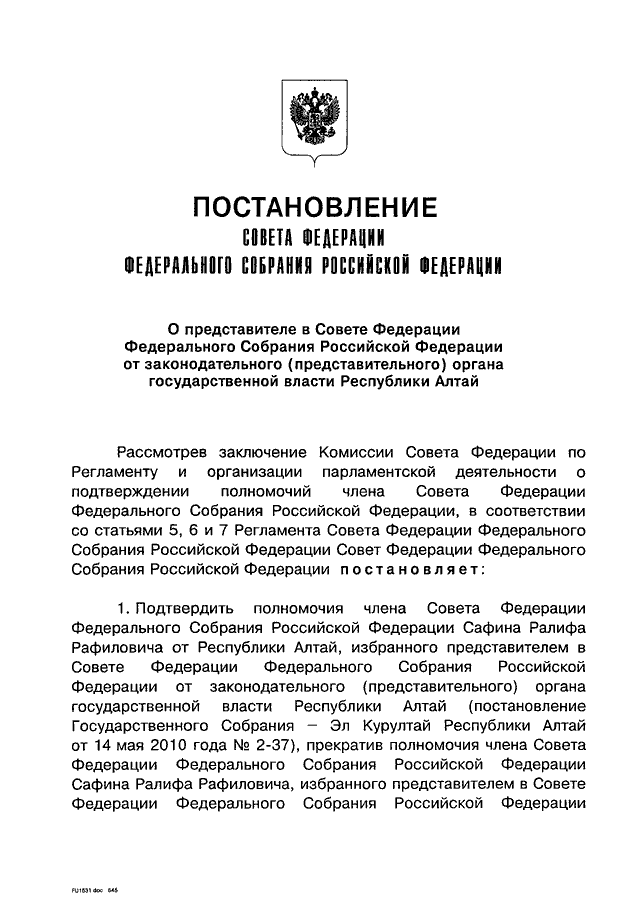 "О ПРЕДСТАВИТЕЛЕ В СОВЕТЕ ФЕДЕРАЦИИ ФЕДЕРАЛЬНОГО СОБРАНИЯ РОССИЙСКОЙ ФЕДЕРАЦИИ ОТ ЗАКОНОДАТЕЛЬНОГО (ПРЕДСТАВИТЕЛЬНОГО) ОРГАНА ГОСУДАРСТВЕННОЙ ВЛАСТИ РЕСПУБЛИКИ АЛТАЙ"