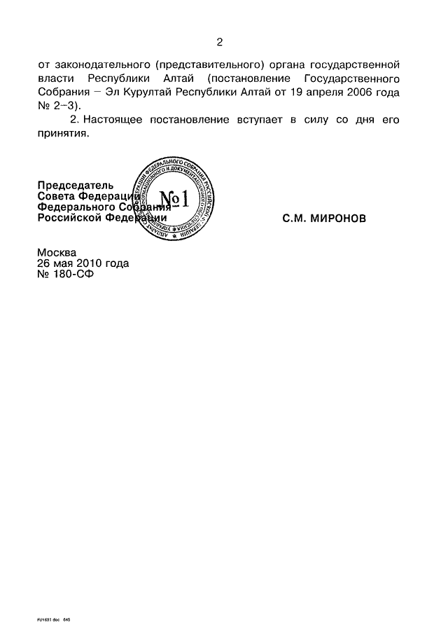 ПОСТАНОВЛЕНИЕ СФ ФС РФ от 26.05.2010 N 180-СФ