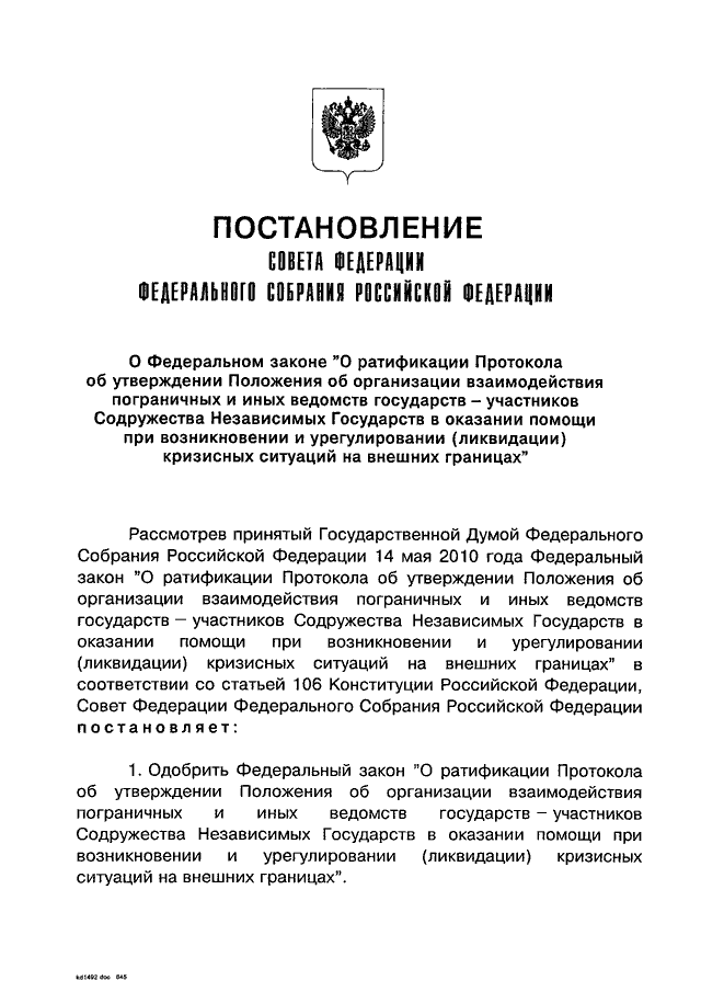 "О ФЕДЕРАЛЬНОМ ЗАКОНЕ "О РАТИФИКАЦИИ ПРОТОКОЛА ОБ УТВЕРЖДЕНИИ ПОЛОЖЕНИЯ ОБ ОРГАНИЗАЦИИ ВЗАИМОДЕЙСТВИЯ ПОГРАНИЧНЫХ И ИНЫХ ВЕДОМСТВ ГОСУДАРСТВ - УЧАСТНИКОВ СОДРУЖЕСТВА НЕЗАВИСИМЫХ ГОСУДАРСТВ В ОКАЗАНИИ ПОМОЩИ ПРИ ВОЗНИКНОВЕНИИ И УРЕГУЛИРОВАНИИ (ЛИКВИДАЦИИ) КРИЗИСНЫХ СИТУАЦИЙ НА ВНЕШНИХ ГРАНИЦАХ"