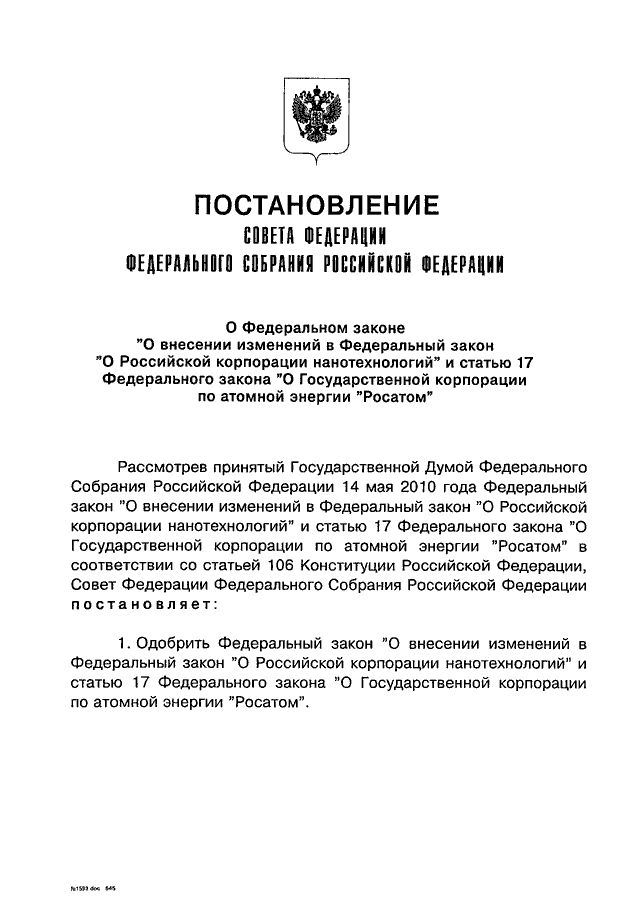 "О ФЕДЕРАЛЬНОМ ЗАКОНЕ "О ВНЕСЕНИИ ИЗМЕНЕНИЙ В ФЕДЕРАЛЬНЫЙ ЗАКОН "О РОССИЙСКОЙ КОРПОРАЦИИ НАНОТЕХНОЛОГИЙ" И СТАТЬЮ 17 ФЕДЕРАЛЬНОГО ЗАКОНА "О ГОСУДАРСТВЕННОЙ КОРПОРАЦИИ ПО АТОМНОЙ ЭНЕРГИИ "РОСАТОМ"