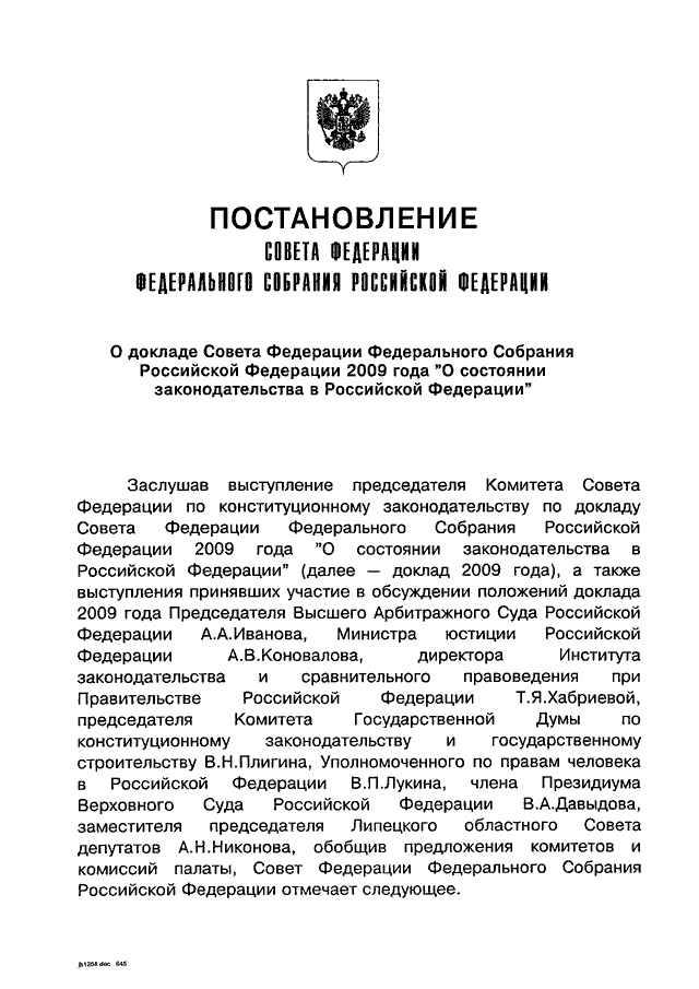 "О ДОКЛАДЕ СОВЕТА ФЕДЕРАЦИИ ФЕДЕРАЛЬНОГО СОБРАНИЯ РОССИЙСКОЙ ФЕДЕРАЦИИ 2009 ГОДА "О СОСТОЯНИИ ЗАКОНОДАТЕЛЬСТВА В РОССИЙСКОЙ ФЕДЕРАЦИИ"