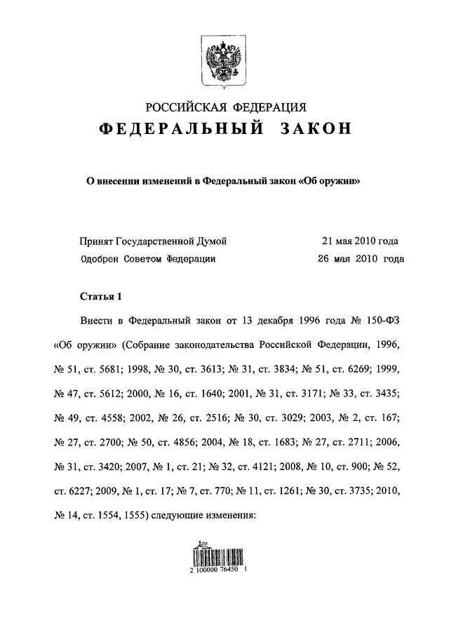 "О ВНЕСЕНИИ ИЗМЕНЕНИЙ В ФЕДЕРАЛЬНЫЙ ЗАКОН "ОБ ОРУЖИИ"