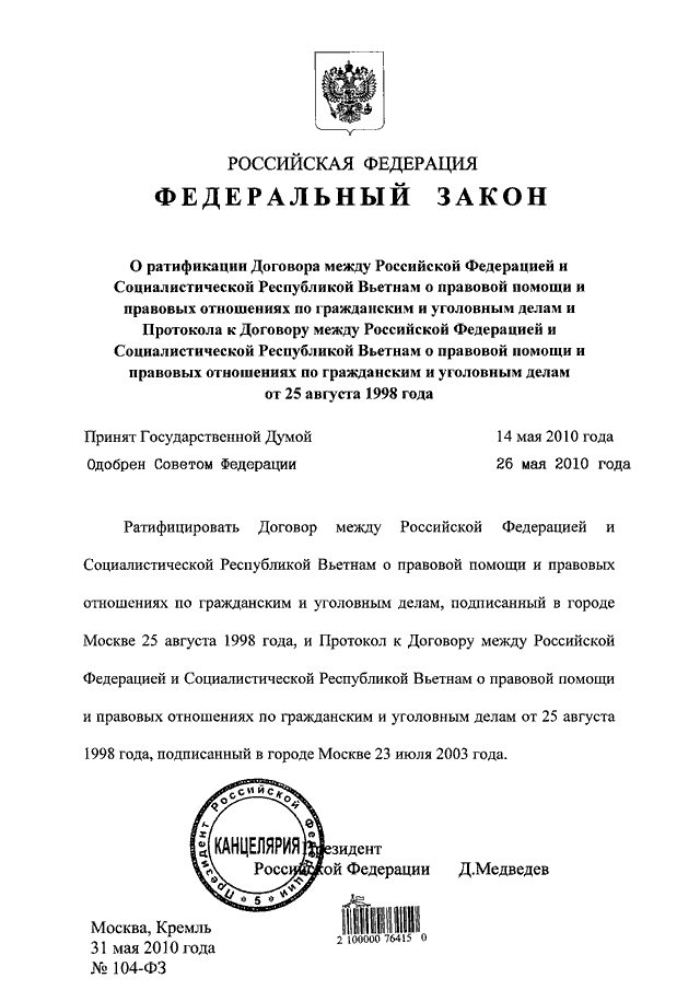 ФЕДЕРАЛЬНЫЙ ЗАКОН от 31.05.2010 N 104-ФЗ