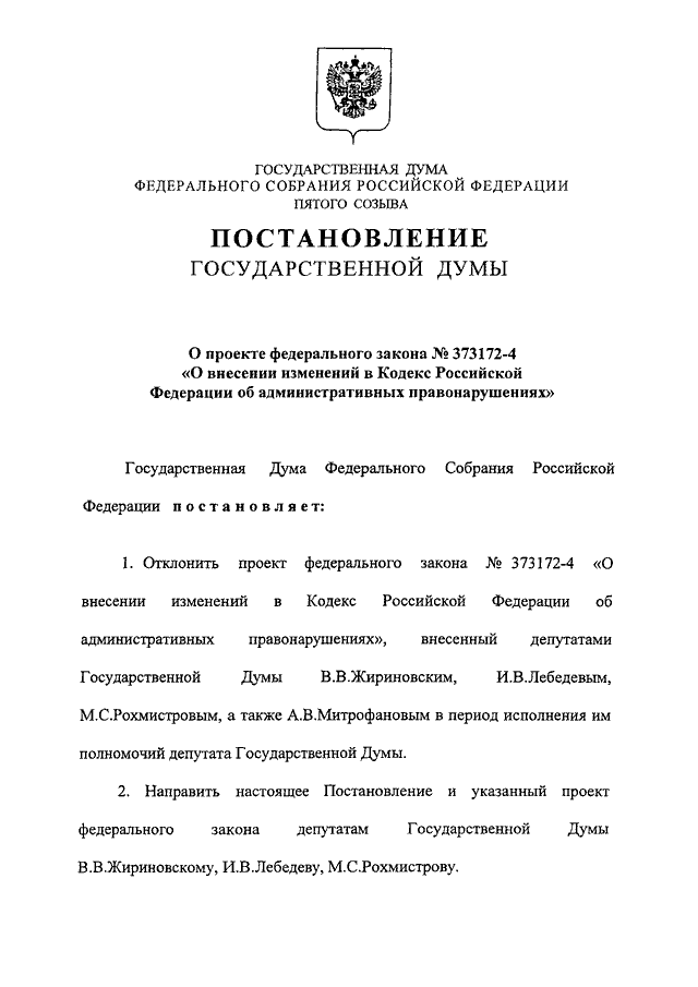 "О ПРОЕКТЕ ФЕДЕРАЛЬНОГО ЗАКОНА N 373172-4 "О ВНЕСЕНИИ ИЗМЕНЕНИЙ В КОДЕКС РОССИЙСКОЙ ФЕДЕРАЦИИ ОБ АДМИНИСТРАТИВНЫХ ПРАВОНАРУШЕНИЯХ"