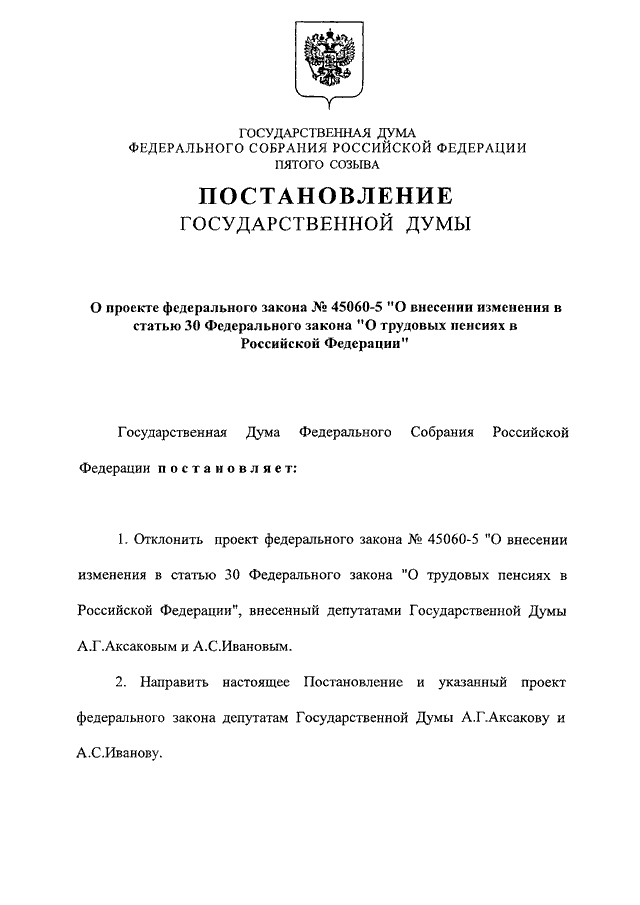 "О ПРОЕКТЕ ФЕДЕРАЛЬНОГО ЗАКОНА N 45060-5 "О ВНЕСЕНИИ ИЗМЕНЕНИЯ В СТАТЬЮ 30 ФЕДЕРАЛЬНОГО ЗАКОНА "О ТРУДОВЫХ ПЕНСИЯХ В РОССИЙСКОЙ ФЕДЕРАЦИИ"