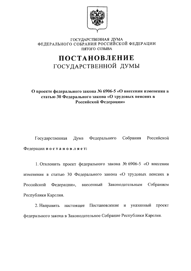 "О ПРОЕКТЕ ФЕДЕРАЛЬНОГО ЗАКОНА N 6906-5 "О ВНЕСЕНИИ ИЗМЕНЕНИЯ В СТАТЬЮ 30 ФЕДЕРАЛЬНОГО ЗАКОНА "О ТРУДОВЫХ ПЕНСИЯХ В РОССИЙСКОЙ ФЕДЕРАЦИИ"
