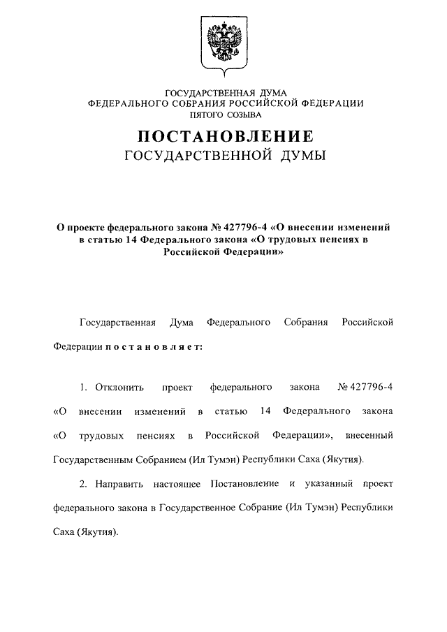 "О ПРОЕКТЕ ФЕДЕРАЛЬНОГО ЗАКОНА N 427796-4 "О ВНЕСЕНИИ ИЗМЕНЕНИЙ В СТАТЬЮ 14 ФЕДЕРАЛЬНОГО ЗАКОНА "О ТРУДОВЫХ ПЕНСИЯХ В РОССИЙСКОЙ ФЕДЕРАЦИИ"