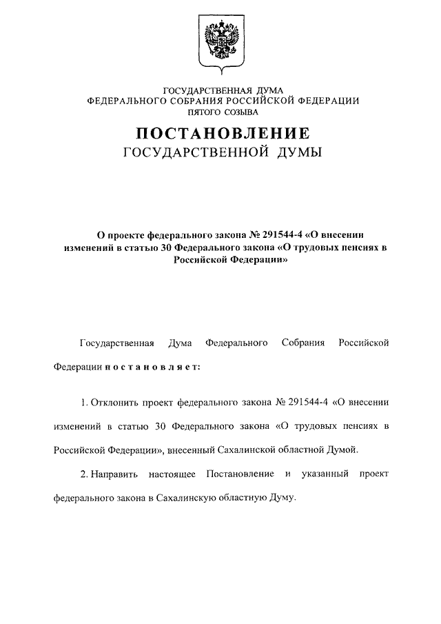 "О ПРОЕКТЕ ФЕДЕРАЛЬНОГО ЗАКОНА N 291544-4 "О ВНЕСЕНИИ ИЗМЕНЕНИЙ В СТАТЬЮ 30 ФЕДЕРАЛЬНОГО ЗАКОНА "О ТРУДОВЫХ ПЕНСИЯХ В РОССИЙСКОЙ ФЕДЕРАЦИИ"