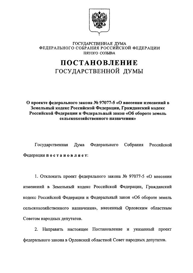 "О ПРОЕКТЕ ФЕДЕРАЛЬНОГО ЗАКОНА N 97077-5 "О ВНЕСЕНИИ ИЗМЕНЕНИЙ В ЗЕМЕЛЬНЫЙ КОДЕКС РОССИЙСКОЙ ФЕДЕРАЦИИ, ГРАЖДАНСКИЙ КОДЕКС РОССИЙСКОЙ ФЕДЕРАЦИИ И ФЕДЕРАЛЬНЫЙ ЗАКОН "ОБ ОБОРОТЕ ЗЕМЕЛЬ СЕЛЬСКОХОЗЯЙСТВЕННОГО НАЗНАЧЕНИЯ"
