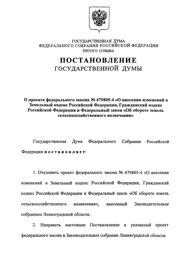 "О ПРОЕКТЕ ФЕДЕРАЛЬНОГО ЗАКОНА N 479805-4 "О ВНЕСЕНИИ ИЗМЕНЕНИЙ В ЗЕМЕЛЬНЫЙ КОДЕКС РОССИЙСКОЙ ФЕДЕРАЦИИ, ГРАЖДАНСКИЙ КОДЕКС РОССИЙСКОЙ ФЕДЕРАЦИИ И ФЕДЕРАЛЬНЫЙ ЗАКОН "ОБ ОБОРОТЕ ЗЕМЕЛЬ СЕЛЬСКОХОЗЯЙСТВЕННОГО НАЗНАЧЕНИЯ"